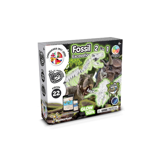 Dinosaurus Fossiel Opgravingen 2-in-1 educatief pakket met dinosaurushandleiding. Met deze 2-in-1 opgravingsset kun je twee fossielen opgraven en in elkaar zetten van je favoriete dinosaurussen - T-rex en Triceratops - die oplichten in het donker. Beleef veel plezier terwijl je leert over de beste opgravingstechnieken en de oorzaak van het uitsterven van de dinosaurussen. Aanbevolen leeftijd: 6 + jaar 263 x 220 x 62 mm