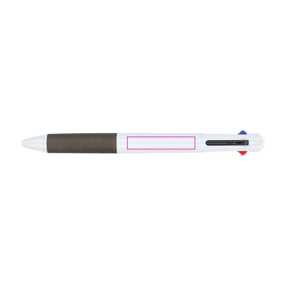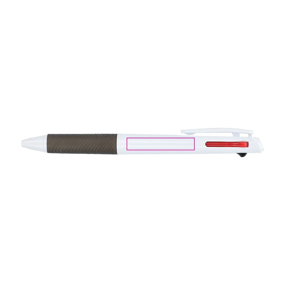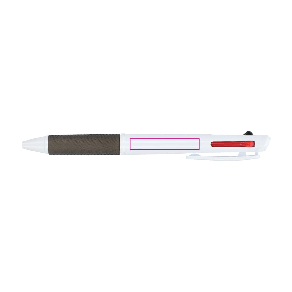 Driekleurige balpen met grip en keycord. De schrijfkleuren zijn blauw, zwart en rood.