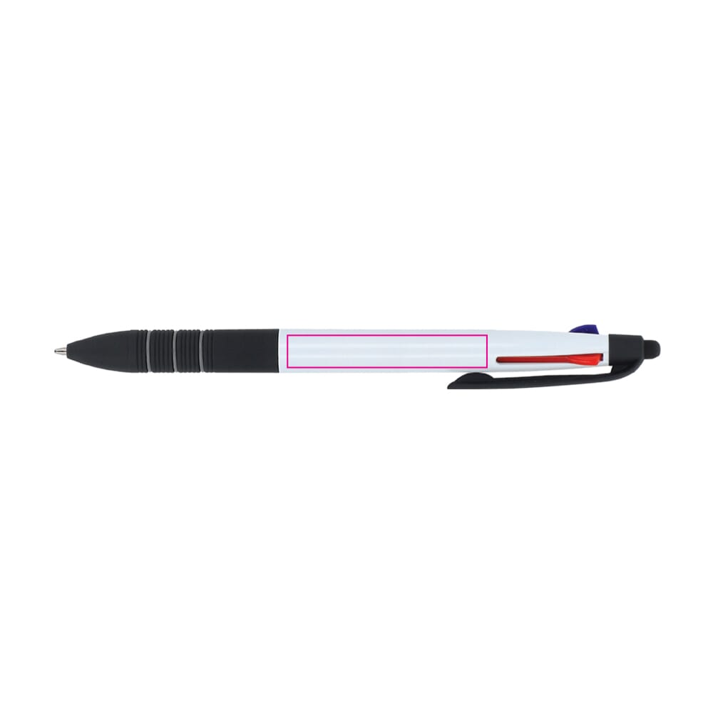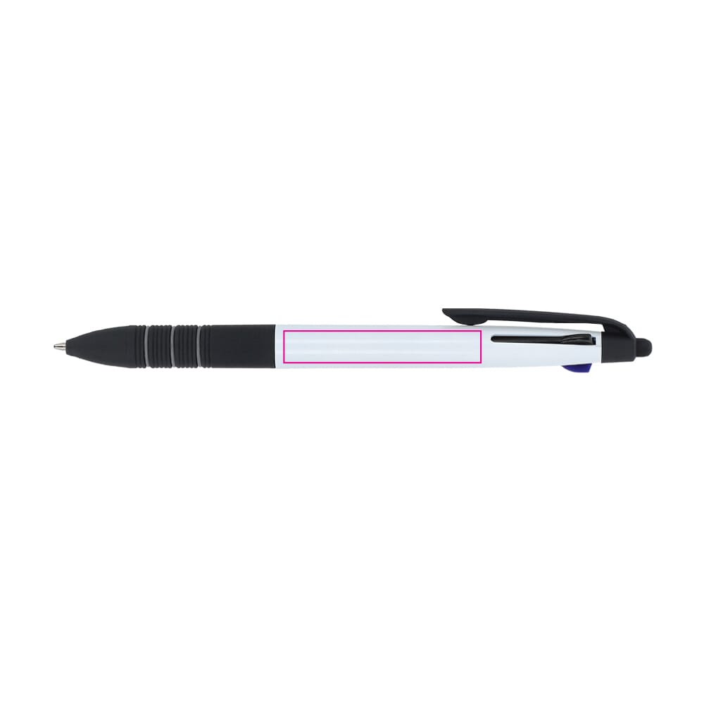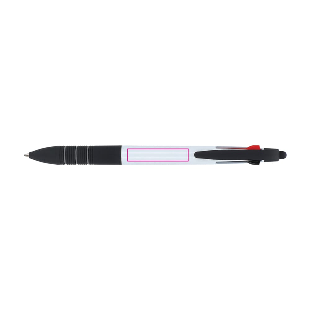 Driekleurige balpen met stylus en ergonomische grip. De schrijfkleuren zijn zwart, blauw en rood.