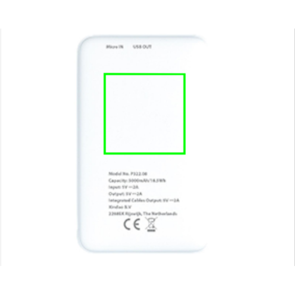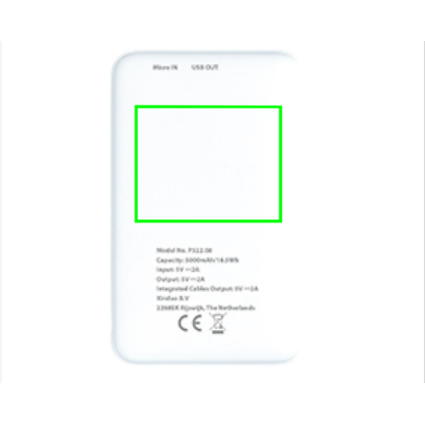 Compacte en platte 5.000 mAh powerbank gemaakt van ABS die gemakkelijk overal mee naartoe te nemen is. Met de 3 in 1 geïntegreerde TPE-kabels is de powerbank compatibel met alle mobiele apparaten die op de markt zijn en direct klaar voor gebruik. Als deze volledig is opgeladen, beschikt u over voldoende energie om uw mobiele telefoon maximaal drie keer op te laden. De powerbank bevat een 5.000 mAh grade-A high density lithiumpolymeerbatterij met een lange levensduur. De lichtindicators geven het resterende energieniveau aan, zodat u altijd weet wanneer u het apparaat opnieuw moet opladen. Input 5V/2A Output 5V/2A.
