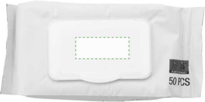 Afgesloten verpakking met 50 stuks natte tissues (75% alcohol). Houdbaar tot 30 april 2024