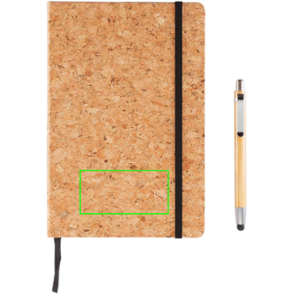 Eco notitieboek gemaakt van kurk met 160 pagina’s van 80g. Inclusief bamboe touchscreen balpen.