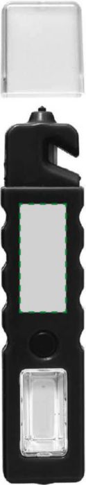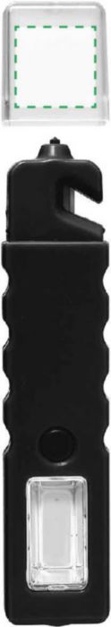 Multifunctionele veiligheidstool. Met COB lamp met vier LEDs (inclusief knipper-functie), een veiligheidshamer voor het breken van de autoruit en een gordelsnijder. Inclusief transparante dop. De tool heeft een magneet en 4 knoopcel batterijen.