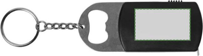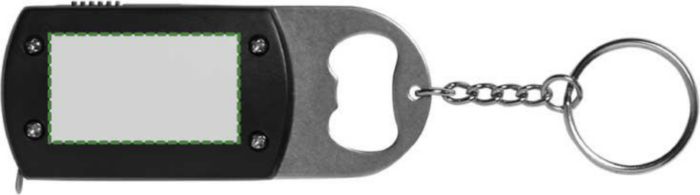 Aluminium flesopener met sleutelhanger, een wit LED lampje en een meetlint/rolmaat (1 meter), incl. batterijen.