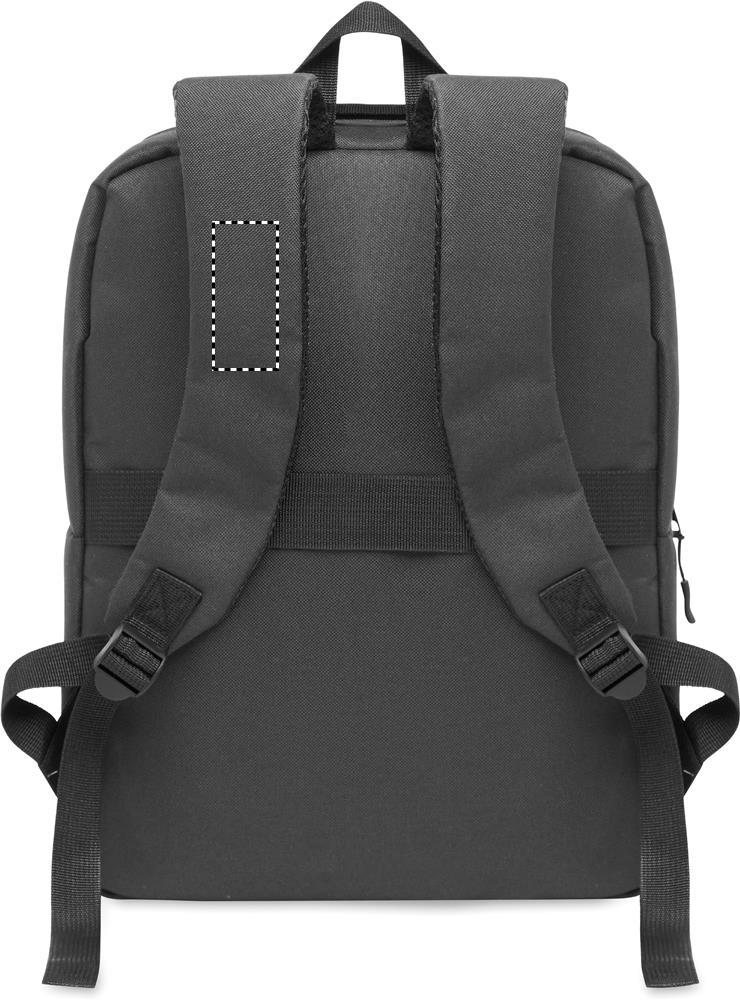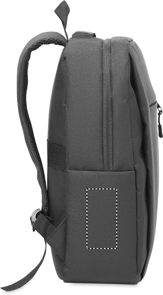 Smalle rugzak van 600D RPET polyester en 210D voering. Heeft een 15'' laptopvak. Inclusief een 10'' tablet buitenvak met rits, 2 binnenvakken, 2 binnen pennenvakjes, voorvak met rits. 2 zijvakken. Zacht gevoerde rug- en schouderbanden en trolley houder.