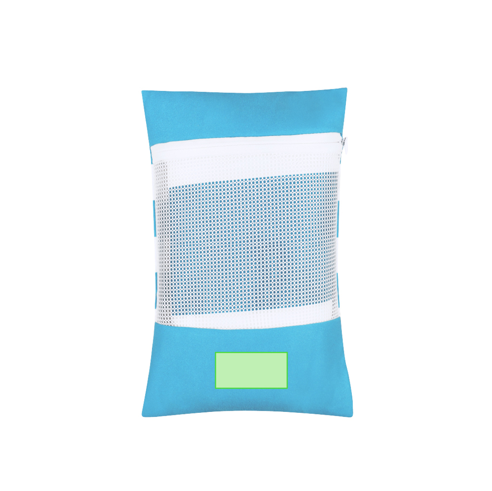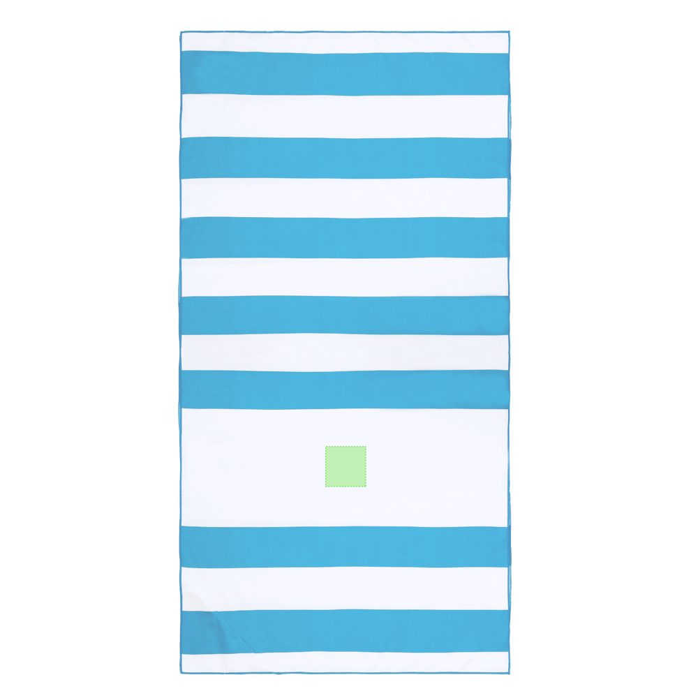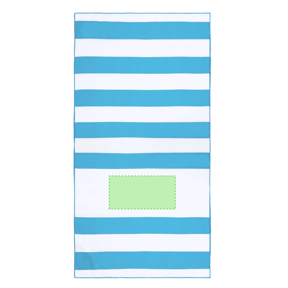 Handdoek met een waterdichte zak en hoes. Gemaakt van zachte polyester van 200 g/m², het heeft een praktische waterdichte driehoekige zak in de hoek, met een ritssluiting ideaal om je persoonlijke bezittingen te beschermen. Het ontwerp met strepen wordt aangevuld met een hoes met gaas en een ritssluiting.