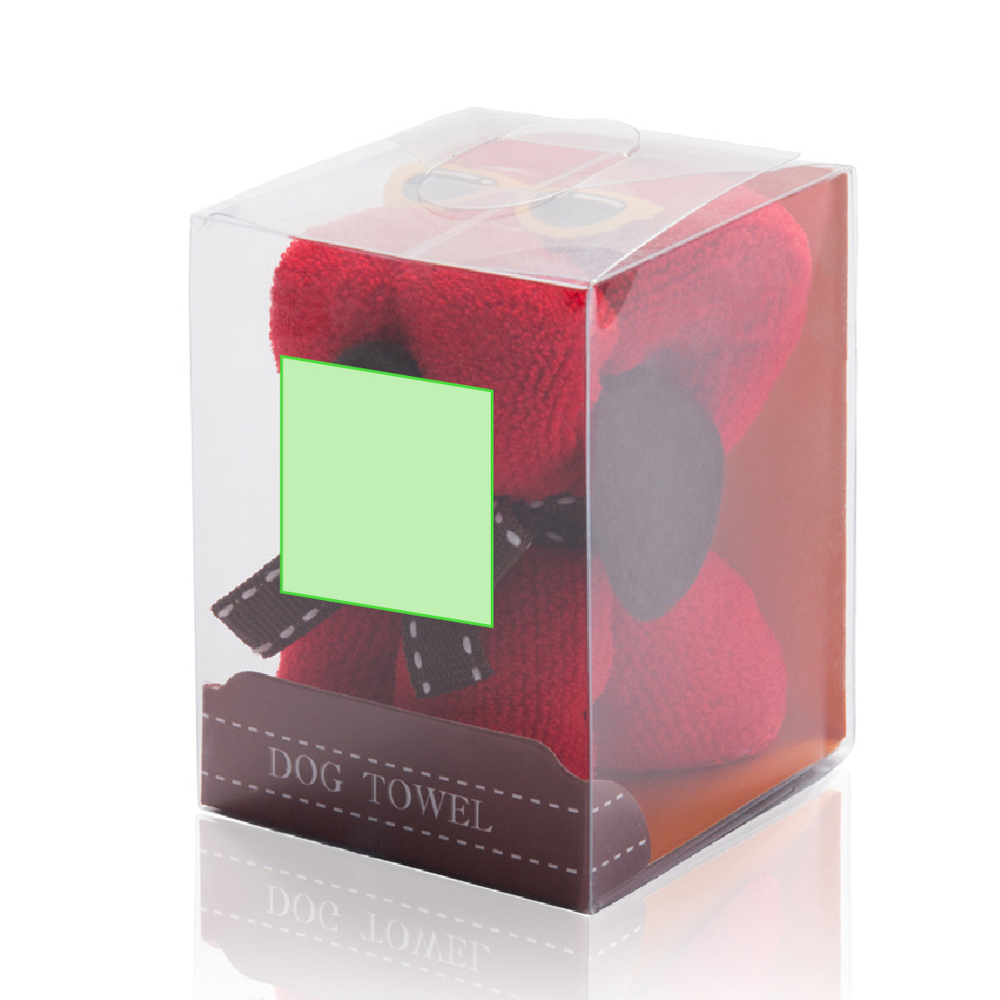 Vrolijke hondenhanddoek van absorberende en zachte microfiber van 310 g / m2 en in levendige kleuren. Gepresenteerd in een transparante, PVC verpakking.