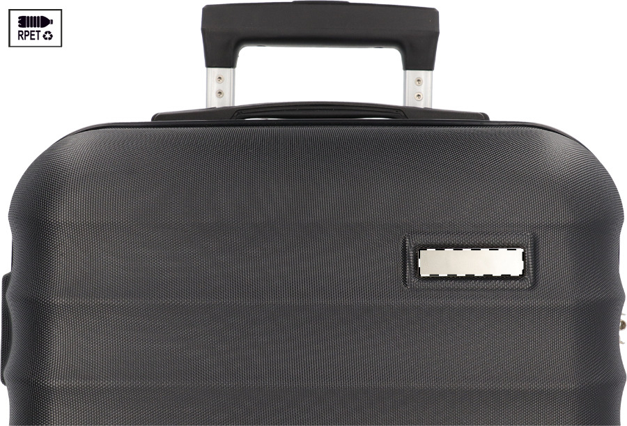 20 inch, harde draagtas van RPET met 4 wielen, telescopisch handvat en cijferslot. Met RPET-binnenvoering en elastische bevestigingsriemen. Met metalen plaatje voor logo-gravure