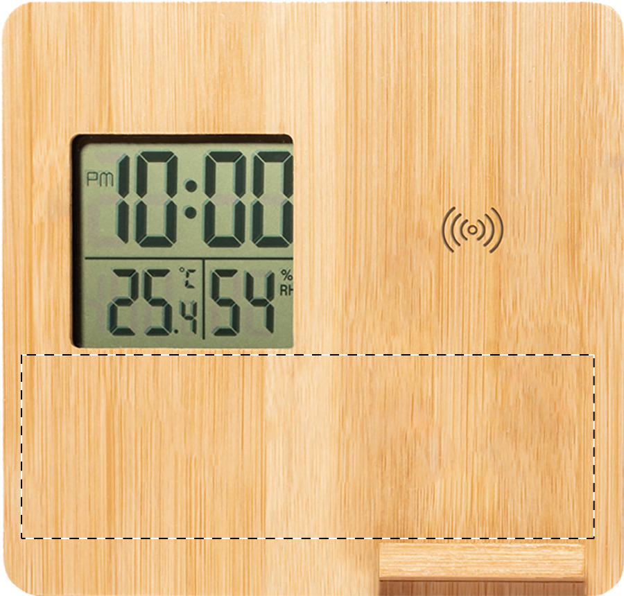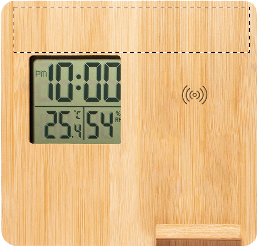 Bamboe weerstation met telefoonhouder en ingebouwde draadloze snellader (10W). Functies: wekker, temperatuur en vochtigheid. Inclusief knoopcelbatterij en USB-oplaadkabel.