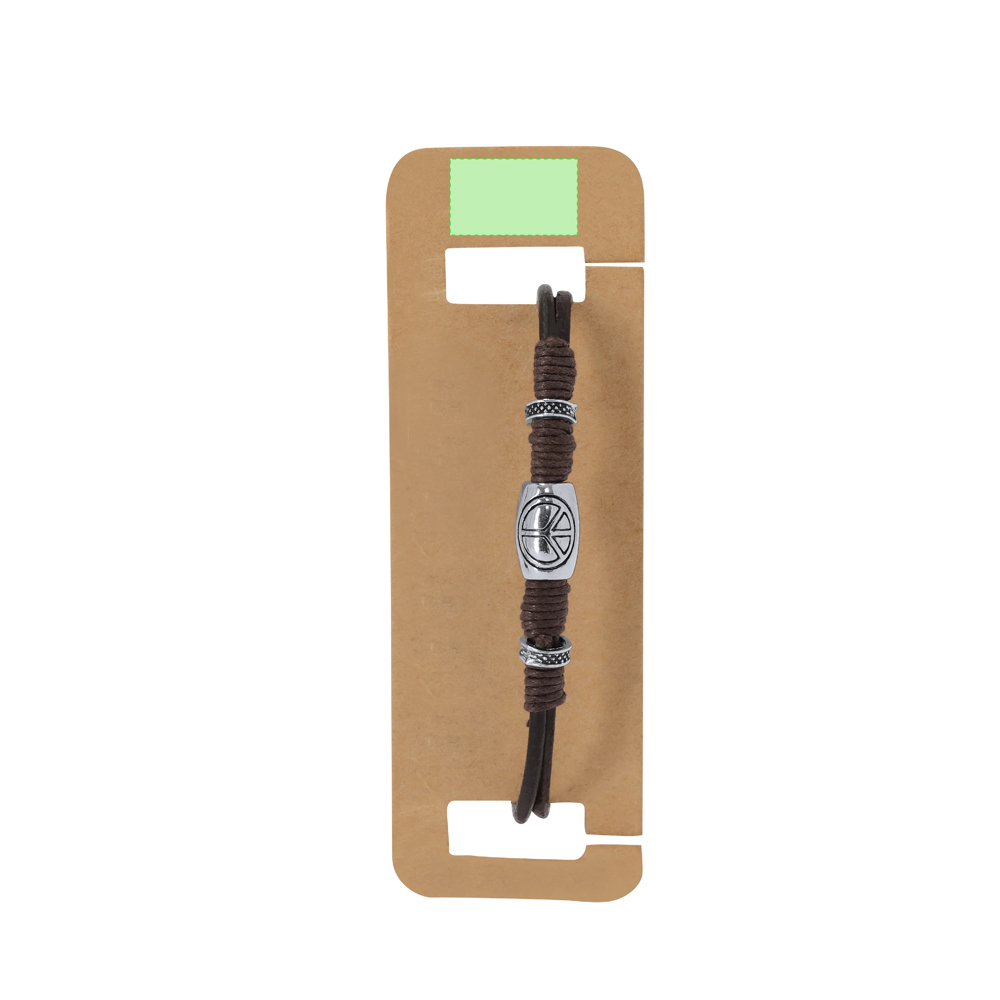Bruin leren armband versierd met gewaxte katoenen koorden en verzilverde kralen, waarvan één met het vredessymbool. Met een originele zilverkleurige legeringssluiting. Gepresenteerd in een kraft kartonnen doos met een oppervlak voor branding.