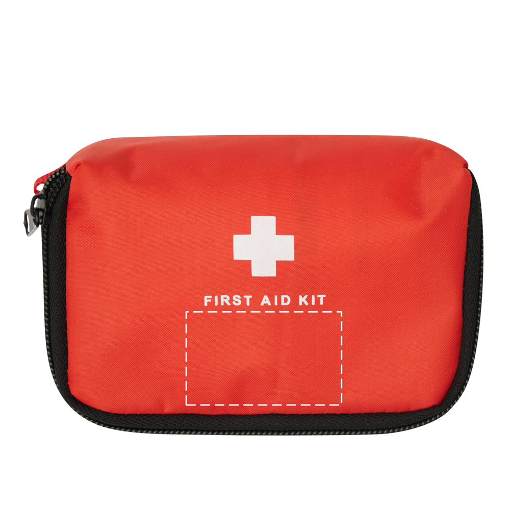 EHBO-set BIGGUARD, 20-delig: bestaande uit 1 klein schaartje, 9 pleisters, 1 fixatiezwachtel, 1 rol kleefband, 1 gaasverband, 2 alcoholdoekjes, 1 kompres, 1 driehoekige doek, 2 veiligheidsspelden, verpakt in een nylon tasje met rondlopende ritssluiting.