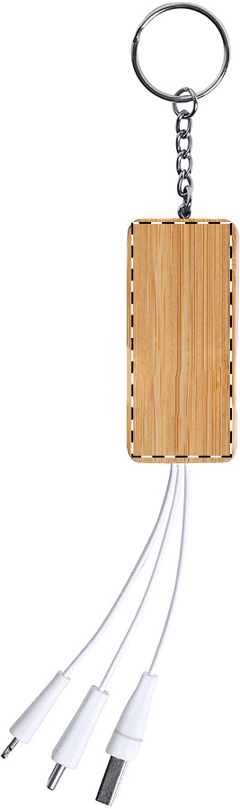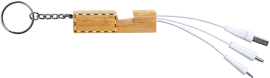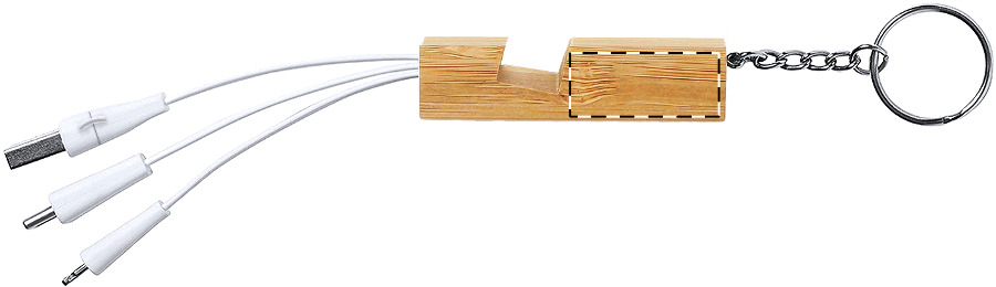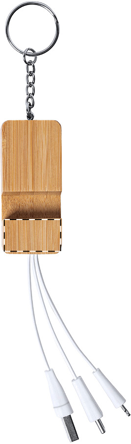 Bamboe sleutelhanger mobiele houder en USB oplaadkabel met micro USB, USB-C en Lightning connectoren. Met USB- en USB-C-ingangen.