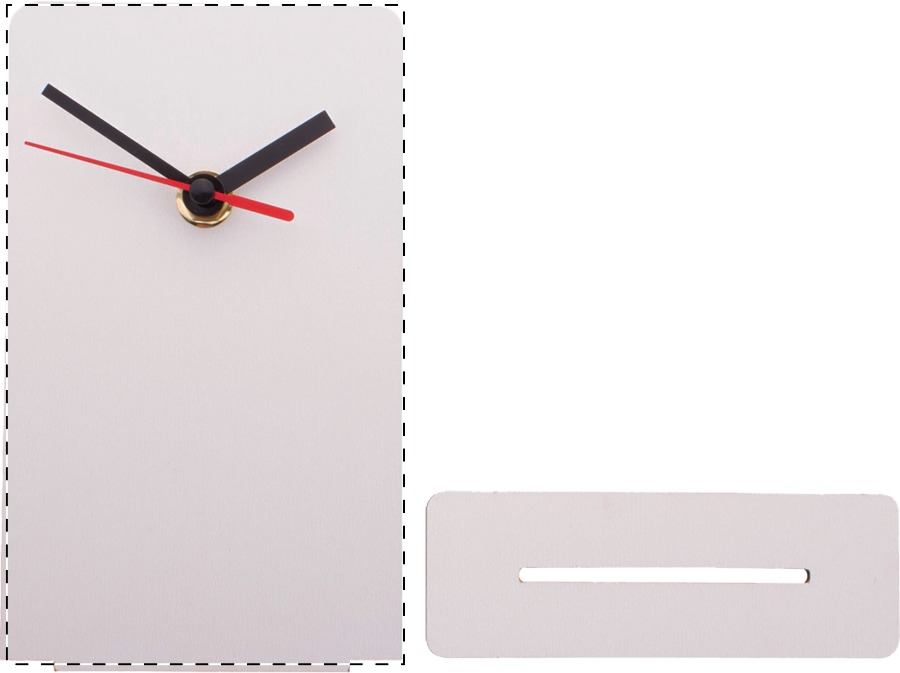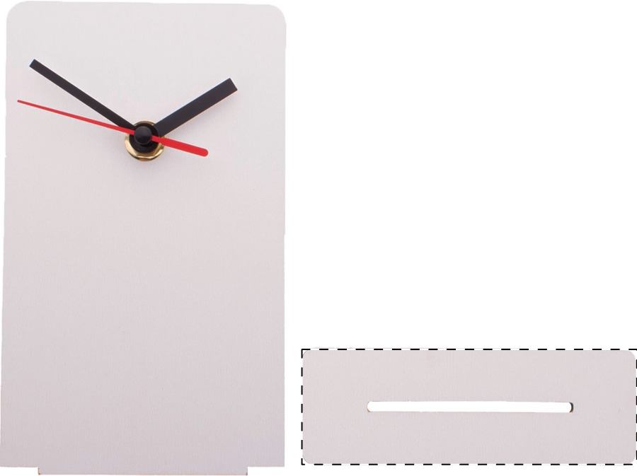 Custom made tafelklok van HDF-hout met op full colour opdruk aan de voorzijde. Werkt op 1 AA batterij, zonder batterij. MOQ: 50 stuks.