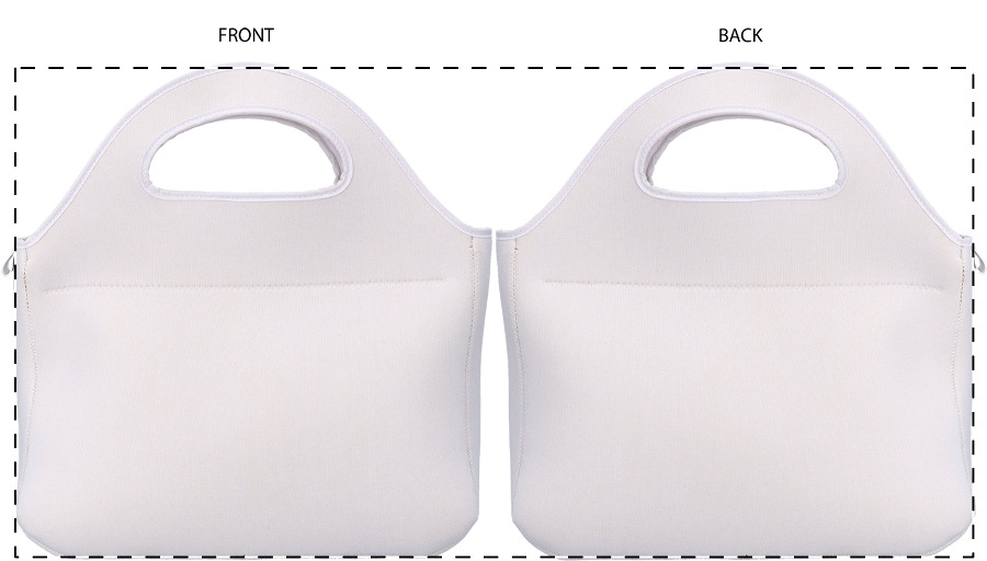 Custom made RPET neopreen lunchtas met ritssluiting en handvatten. Met all over sublimatie bedrukking en onderscheidend RPET-label. MOQ: 25 stuks.