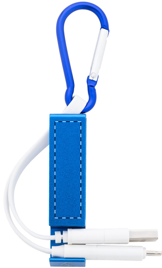 USB-oplaadkabel met karabijnhaak van gerecycled aluminium en mobiele houder met flesopenerfunctie. Met micro USB, USB-C en Lightning connectoren. Met USB- en USB-C-ingangen.