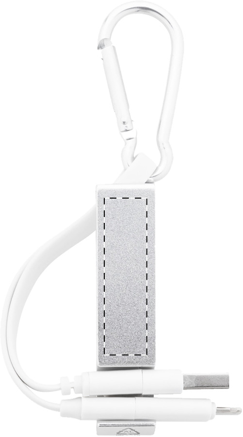 USB-oplaadkabel met karabijnhaak van gerecycled aluminium en mobiele houder met flesopenerfunctie. Met micro USB, USB-C en Lightning connectoren. Met USB- en USB-C-ingangen.