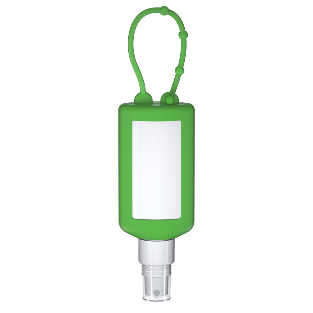 PET-fles van 50 ml (wit) met witte pompdop en transparante beschermdop; siliconen hoes en lus in groen. Navulbaar. Fles van 100% gerecycled PET, wit met lichte R-PET-kleuring.