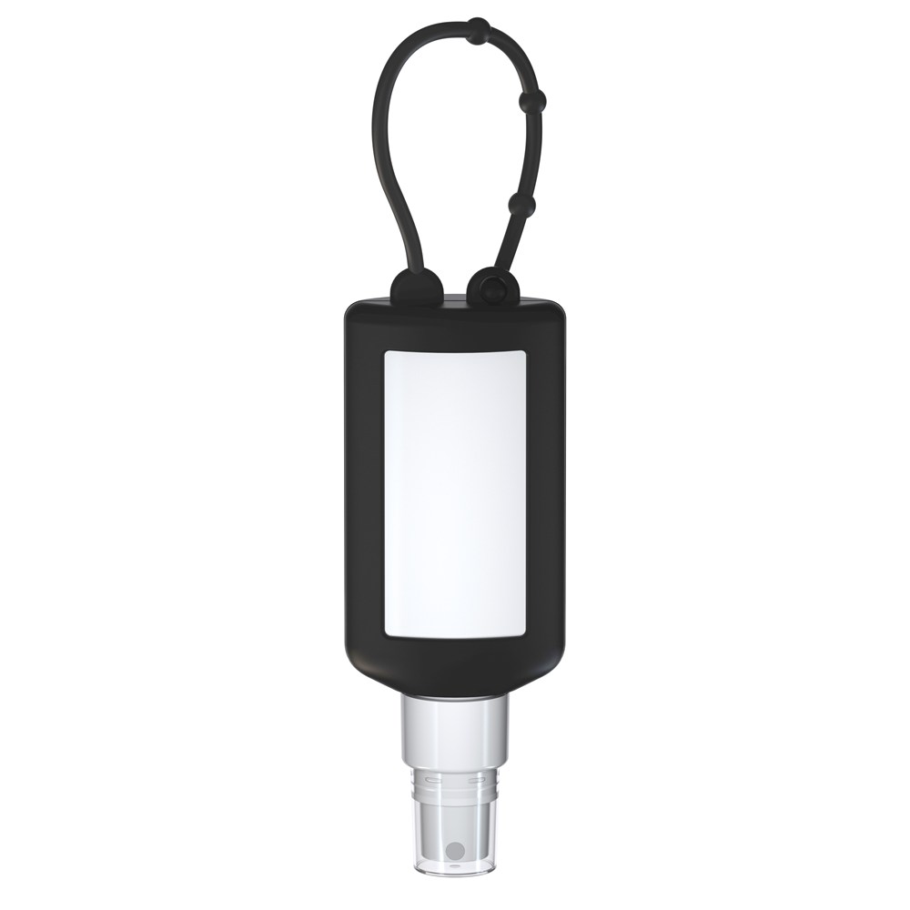 PET-fles van 50 ml (wit) met witte pompdop en transparante beschermdop; siliconen hoes en lus in zwart. Navulbaar. Fles van 100% gerecycled PET, wit met lichte R-PET-kleuring.