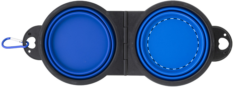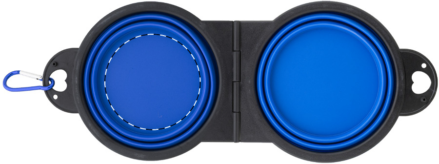 Opvouwbare huisdierenbak in duurzaam TPE met twee compartimenten van 450 ml en bijpassende aluminium karabijnhaak in kleur.