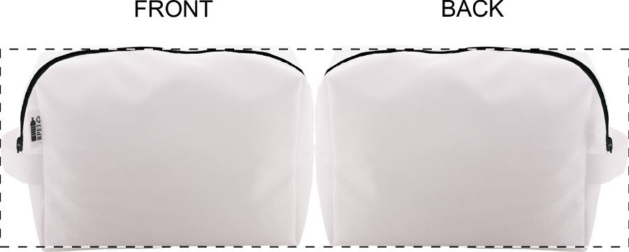 Custom made RPET toilettas met ritssluiting van 600D RPET polyester met draagbeugel. Met all-over sublimatie bedrukking. MOQ: 50 stuks.