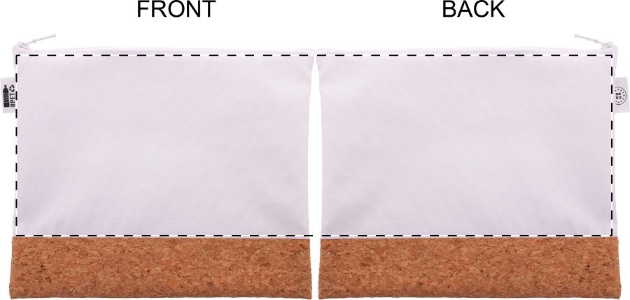 Custom made make-up tasje met rits van 600D RPET polyester en natuurkurk. Met all-over sublimatie bedrukking. MOQ: 50 stuks.