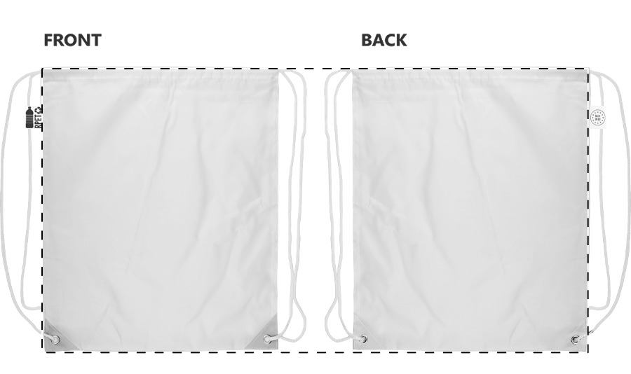 Custom made tas met trekkoordsluiting met versterkte PU-lederen hoeken en touwtjes in bijpassende kleur, 190T RPET polyester. Met all-over sublimatiebedukking en onderscheidend RPET-label. MOQ: 25 stuks.