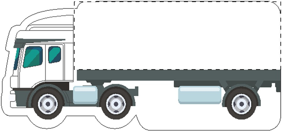 Custom made vrachtwagenvormige full colour bedrukte koelkastmagneet met sticky notitieblok. Bevat 50 vellen gerecyclede sticky notes (75 × 75 mm). MOQ: 100 stuks.