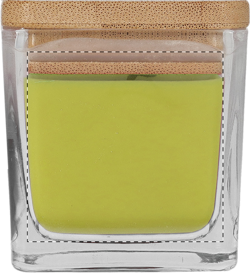 Geurende plantaardige waskaars in glazen houder met bamboe deksel. Met 50 gram was. Brandtijd: 8 uur. In kraftpapieren doos.