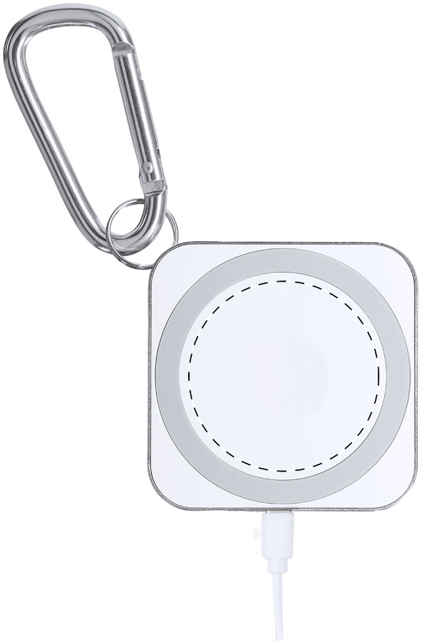 Magnetische draadloze snellader (15W) in aluminium behuizing met karabijnhaak. Ontworpen voor het opladen van smartphones, oortelefoons en smartwatches. Compatibel met iPhone® 12 of nieuwer.