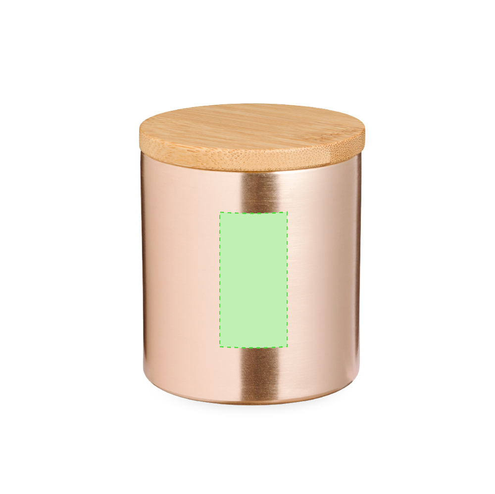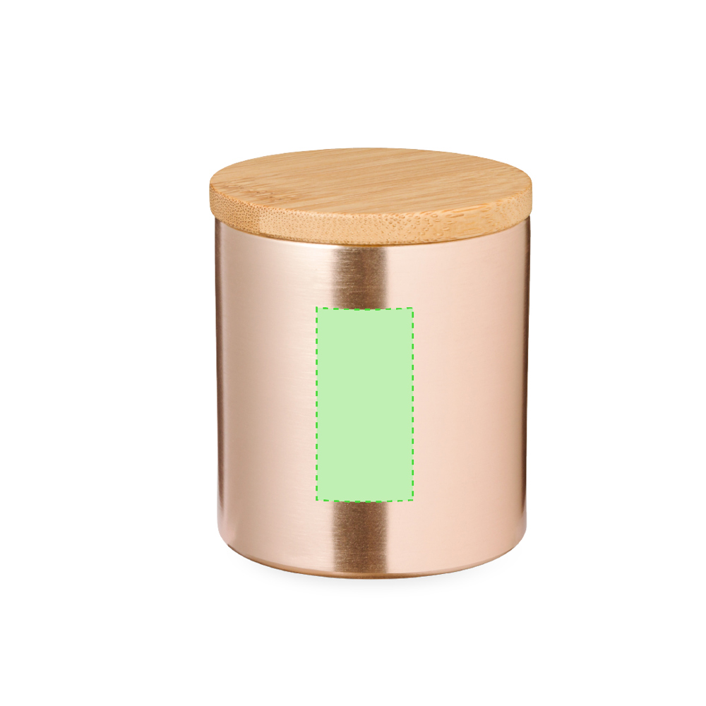 "Vanille geurkaars. Gepresenteerd in een metalen pot met een deksel van bamboe. Pot verkrijgbaar in een breed scala aan kleuren, met metalen afwerking. Individueel gepresenteerd in een kraft-designdoos.Materialen zoals bamboe stimuleren het gebruik van natuurlijke grondstoffen en verminderen de uitstoot van verontreinigende stoffen. Bovendien is bamboe afkomstig van een zeer resistente en veelzijdige plant, met een snelle groei en regeneratie, waardoor het een uitstekend alternatief is voor het gebruik van traditioneel hout."
