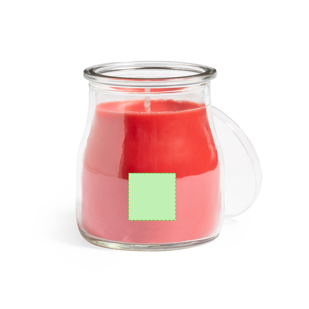 Geurkaars in glazen pot, verkrijgbaar in verschillende geuren: witte vanille rode bosvruchten oceaanblauw en mosgroen. Met Made In Europe logo.