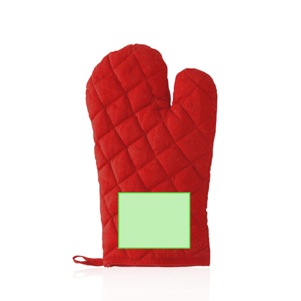 Hoogwaardige keukenhandschoen van zacht katoen in verschillende kleuren. Met een gladde zijde, speciaal ontworpen voor het bedrukken en een ophanglint.